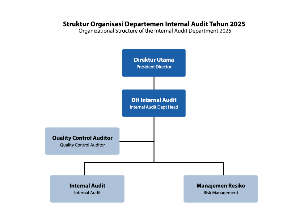 Unit Audit Internal merupakan tim pemeriksa independen yang dipimpin oleh seorang Kepala Audit Internal yang diangkat, diberhentikan dan bertanggung jawab langsung kepada Direktur Utama atas persetujuan Dewan Komisaris. Kepala Audit Internal dalam pelaksanaan tugasnya dibantu oleh Unit Audit Internal.
